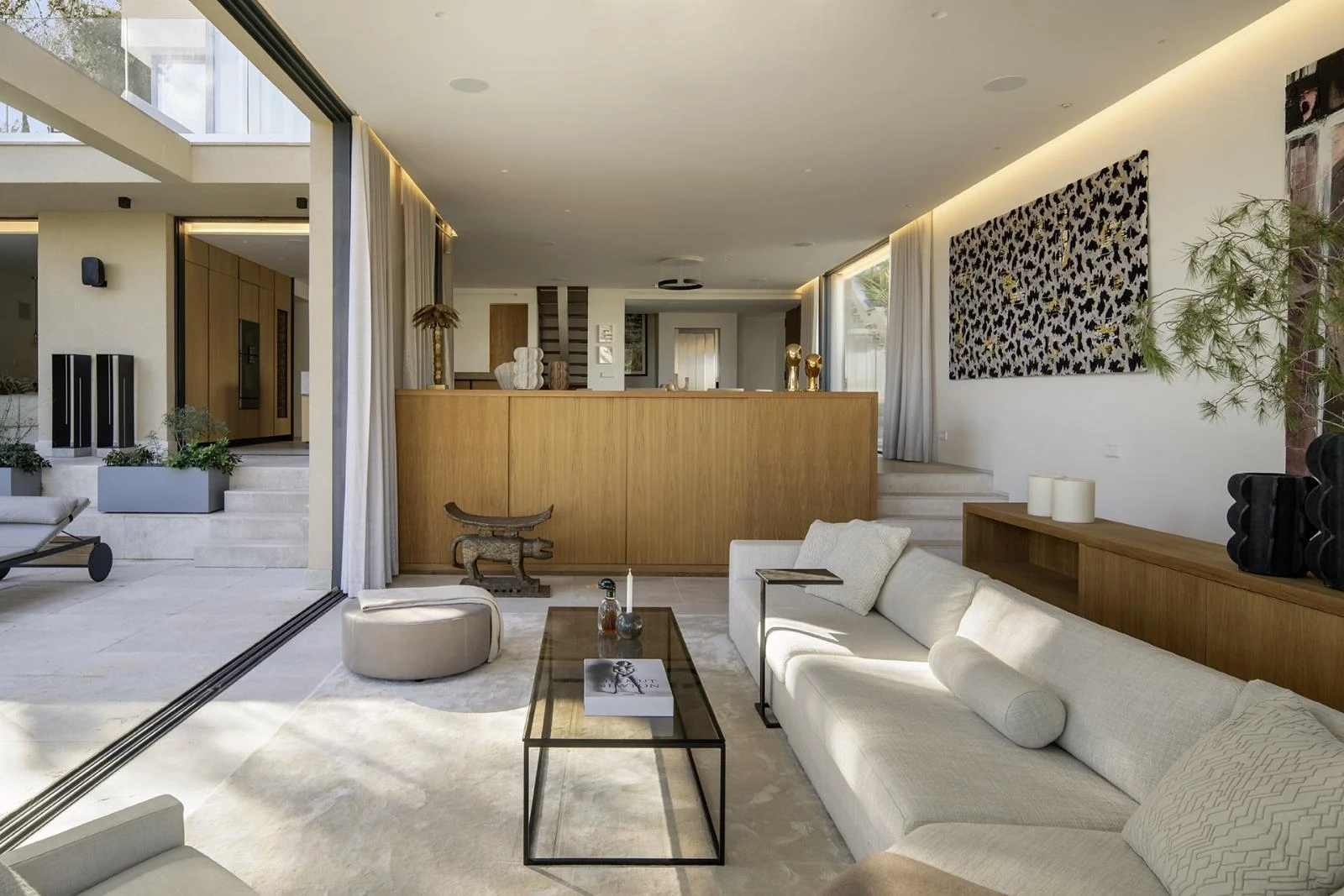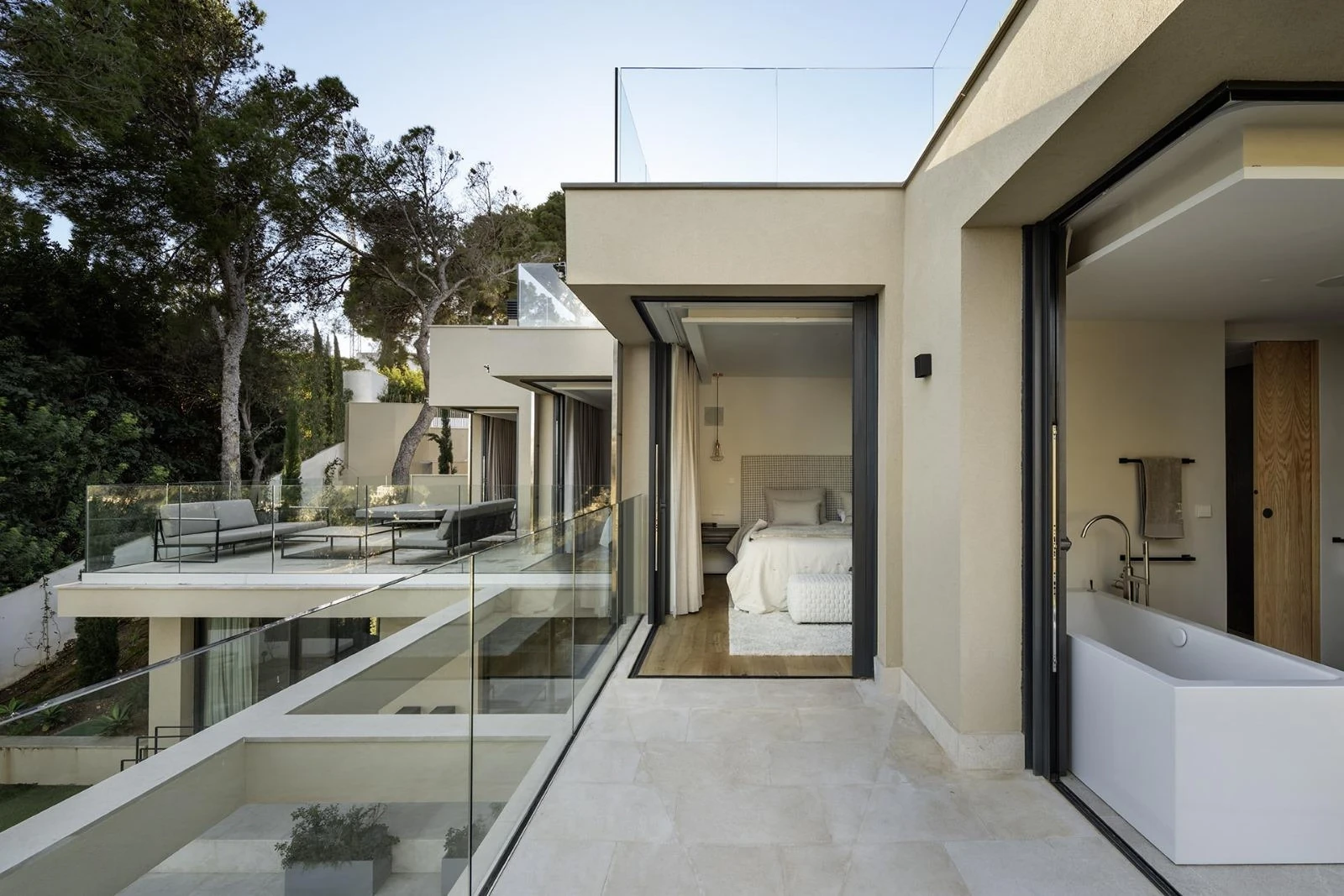 Life in Villa Palma moves effortlessly between inside and out. Large sliding glass panels dissolve the boundary between living spaces, terraces and pool, while filtered daylight and surrounding greenery shape the atmosphere throughout the day.