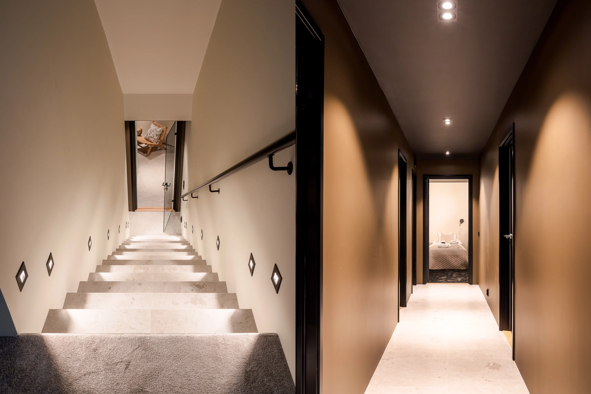 Interior spaces are tightly composed and carefully sequenced. A muted palette of stone, wood and dark finishes adds depth and tactility, while controlled lighting reinforces a calm, composed atmosphere. Every element is considered, leaving little excess and little distraction.